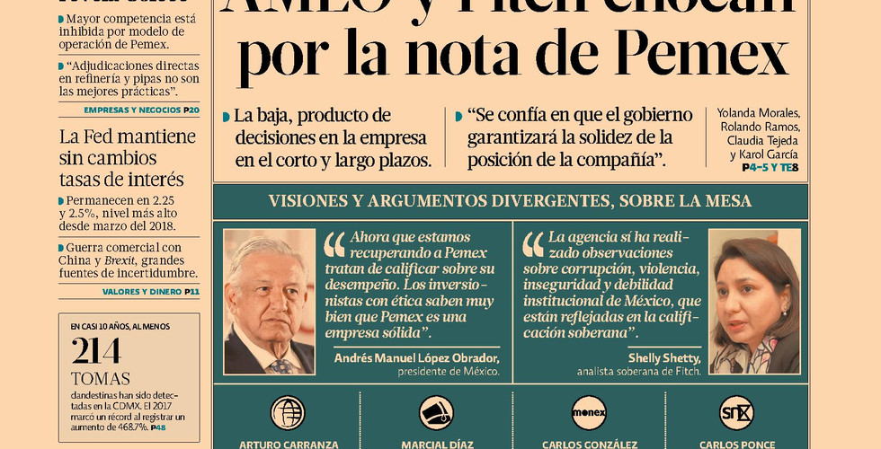-Reforma: Exigen analizar la nueva refinería -El Universal: Dan superbonos en Michoacán a maestros de CNTE -La Jornada: AMLO: “muy hipócrita”, la postura de Fitch sobre Pemex -Milenio Diario: “Ya no hay guerra” -Excélsior: “Se acabó la guerra contra el crimen” -El Financiero: Desaceleró la economía al cierre de 2018 -El Economista: AMLO y Fitch chocan por la nota de Pemex -24 Horas: Caso Venezuela: México convoca a “neutrales”; OEA ve ridículo mediar -24 Horas: Moody's da voto de confianza; Banxico pide certidumbre -Reporte Indigo: Resucitar a Pemex -La Crónica de Hoy: Bodega de huachicol puso en peligro a Azcapotzalco -El Sol de México: Van a decir que quiero matar a Jesucristo: Romero Deschamps