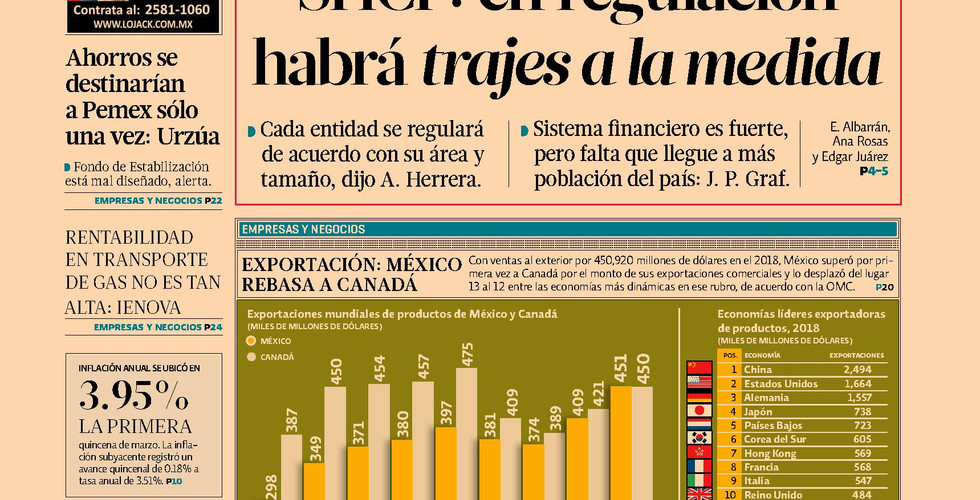 -Reforma: Frenan obra estados por pagar deudas -El Universal: Crecen asaltos y homicidios en motos en CDMX -La Jornada: Orthofix, historia de corrupción en el IMSS en 3 sexenios -Milenio Diario: Olga Sánchez: la crisis forense de hoy, por olvido institucional -Excélsior: Lista, la Ley para eliminar inspecciones -El Financiero: AMLO quiere más competencia: Citi -El Economista: SHCP: en regulación habrá trajes a la medida -La Razón: Orta a mandos de la Policía: se acabó el estado de confort -24 Horas: Advierte la banca que el crédito crecerá menos que en 2018 -Reporte Indigo: Sector a media luz -La Crónica de Hoy: “México, en vías de ser una fábrica de enfermos” -El Sol de México: “Nada me va detener y nada me va a espantar”