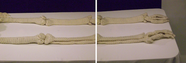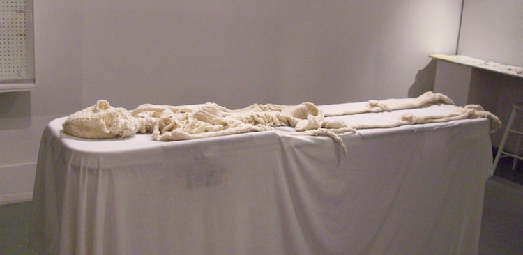 La instalación final consistió en colocar al esqueleto tejido sobre una camilla, con los órganos puestos en su lugar para darle la apariencia de algo que podrías encontrar en un laboratorio real. “Antes de hacer esta pieza tenía un gran interés por la historia médica, Frankenstein, el pensamiento de la Ilustración, la época victoriana, el nacimiento de la industria (producción textil), la investigación criminal, las prácticas mortuorias y los museos”, compartió Papp. “Hice este trabajo para explorar mi interés en el cuerpo humano.”