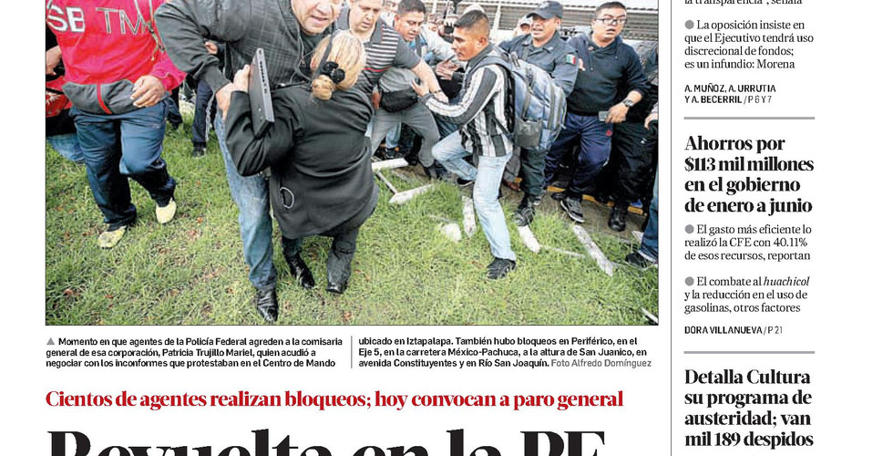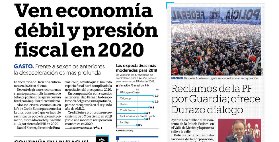 -Reforma: Se rebelan en PF; convocan a paro. -El Universal: AMLO no moverá fichas en el gabinete: Monreal -La Jornada: Refuerza la Guardia Nacional la vigilancia en el río Suchiate -La Jornada: Revuelta en la PF contra su paso a la Guardia Nacional -La Jornada: Revuelta en la PF contra su paso a la Guardia Nacional. -Milenio Diario: Policías federales se rebelan por agravios; AMLO ve mano negra -Excélsior: AMLO descarta despedir a policías -El Financiero: Ven economía débil y presión fiscal en 2020 -El Economista: México afianza con EU la sociedad comercial -La Razón: Rebelión en Policía Federal; AMLO acusa mano negra -24 Horas: Las comunicaciones hicieron crisis... y la gente lo padeció -Reporte Indigo: Los olvidados -La Crónica de Hoy: Rebelión de la Policía Federal; exigen mantener prestaciones -El Sol de México: La CFE sí contrata seguridad privada
