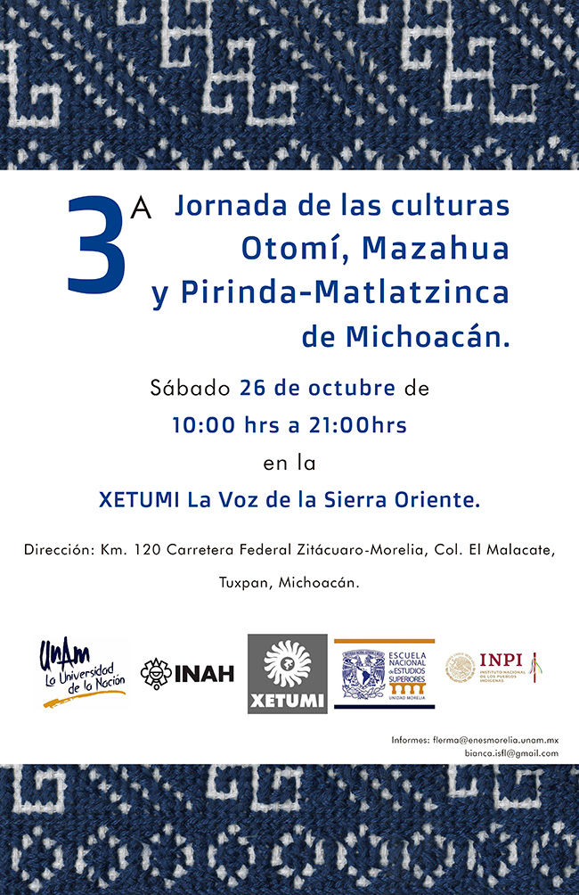 El próximo sábado 26 de octubre del 2019 se llevará a cabo en la radiodifusora XETUMI-XHTUMI “La Voz de la Sierra Oriente” del Sistema de Radiodifusoras Culturales Indígenas del Instituto Nacional de Pueblos Indígenas (INPI) la 3ª Jornada de las culturas otomí, mazahua y pirinda-matlatzinca de Michoacán.