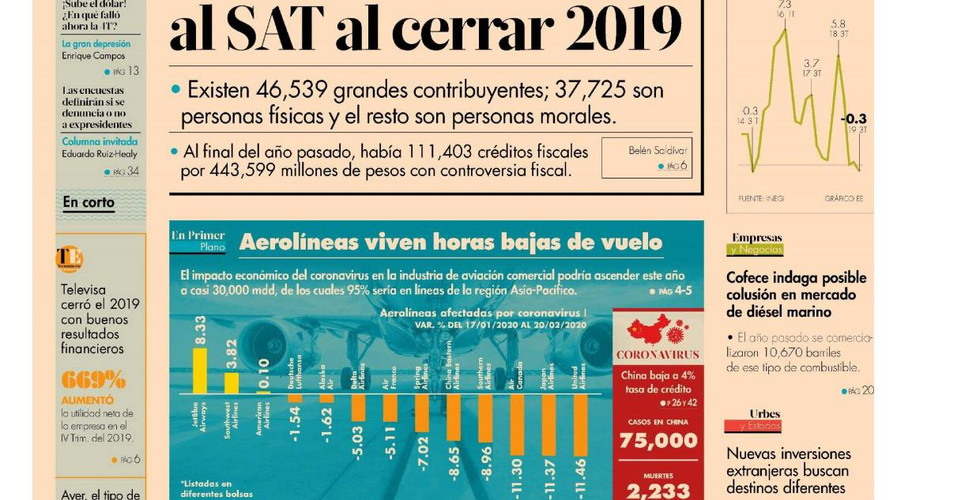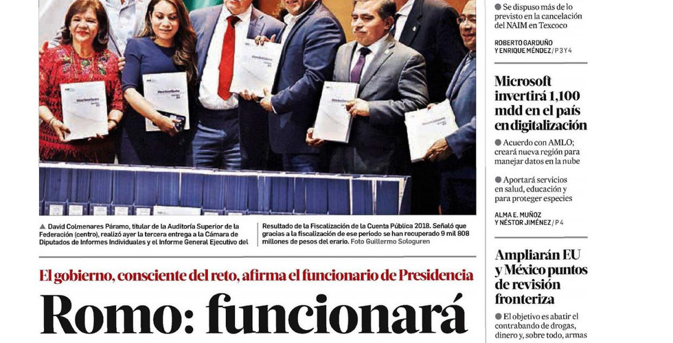 -Reforma: Sella EPN sexenio: saqueo y derroche -El Universal: Hacienda pide arrestar a exesposa de Duarte -La Jornada: Romo: funcionará la 4T sólo con un mayor crecimiento -Milenio Diario: Durazo: para uso militar de EU, armas de Bavispe y Culiacanazo -Excélsior: Los desaparecían en cocinas del terror -El Financiero: Prepara Hacienda reforma al sector financiero -El Economista: Grandes causantes debían 231,787 mdp al SAT al cerrar 2019 -La Razón: Toma fuerza #UnDíaSinNosotras y su convocatoria a paro nacional. -24 Horas: #Fucam pone fin a su atención gratuita para mujeres con cáncer -La Crónica de Hoy: Sheinbaum: la riqueza de la UNAM, ligada a su autonomía -El Sol de México: Desviaron 2 mmdp en aeropuerto de Texcoco -El Heraldo de México: Sí hay pruebas suficientes vs. monstruos -ContraRéplica: Alerta Amber, un timo: expertos