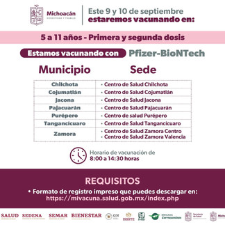 💉Del 2 al 15 de septiembre, vacunación contra COVID-19 para menores de 5 a 11 años.